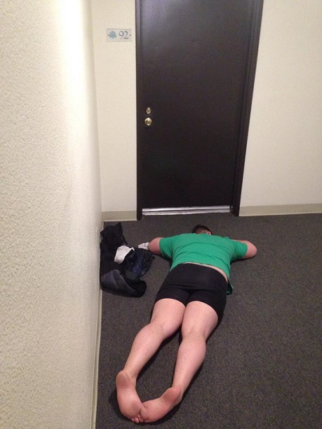 1:58AM: I open the door and poke my head out. He has put his underwear back on and passed out on the floor between me and my neighbor’s door. I snap a picture.