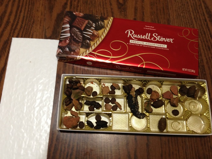 Eventually, Christmas rolled around. Dan opened my present. It was awesome. Later, Dan gave me a present. I opened it. It was a box of chocolates. Okay, not really my thing, but hey, not a huge deal, Christmas is more about giving than receiving, right? I popped open the box….to find that, far from delicious chocolate treats, my brother had eaten them and filled the box full of gravel and cat shit. I am dead serious. Here is a picture.