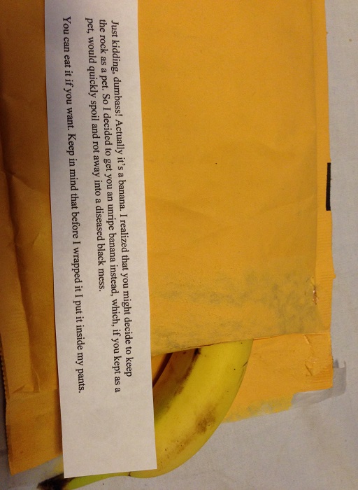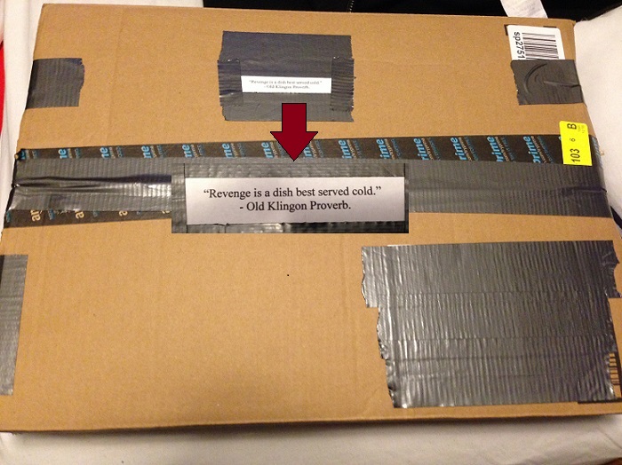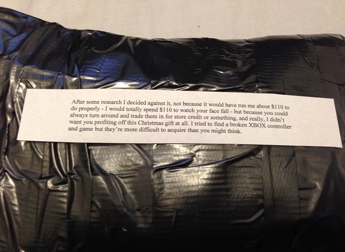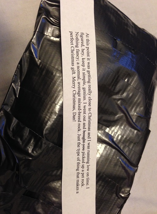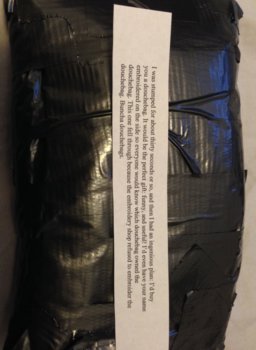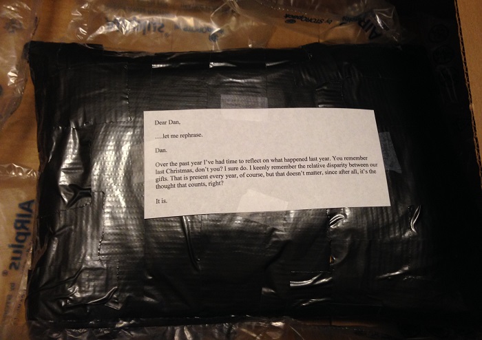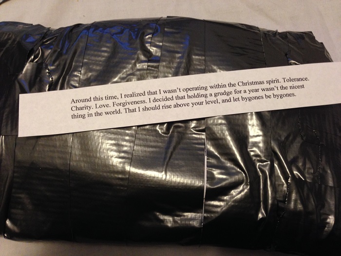 I spent 2013…plotting. My mind went to dark places. It came back towards the light. It went back to dark places. Eventually I settled on a plan, and armed with a bunch of mailing envelopes and two full rolls of duct tape, I went to work. The concept of multi-wrapping gifts has been around for awhile (otherwise known as Inception wrapping) but to kick it up a notch, each layer is fully wrapped in several layers of duct tape to make the actual process of opening the present a sweaty, 45-minute endeavor.