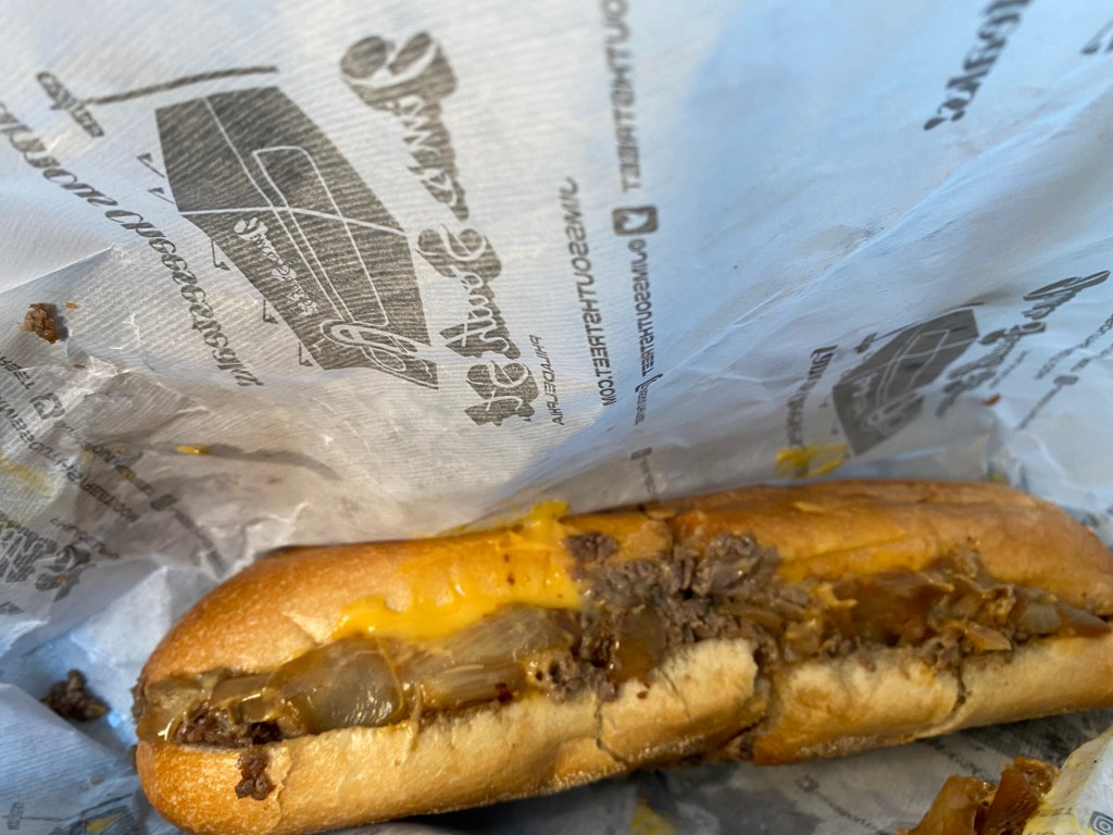 I stopped off in Philadelphia to get a cheesesteak and went to Jim’s South Street. I parked maybe twelve blocks away and walked to get there. There was a line outside the door. While I was waiting outside the door, a trio of extremely drunk girls (this was maybe 4:30pm, but hey, it’s spring break) walked past. One of them stopped, inhaled deeply, and said “that smells so fucking good” to her friends. You’re telling me.