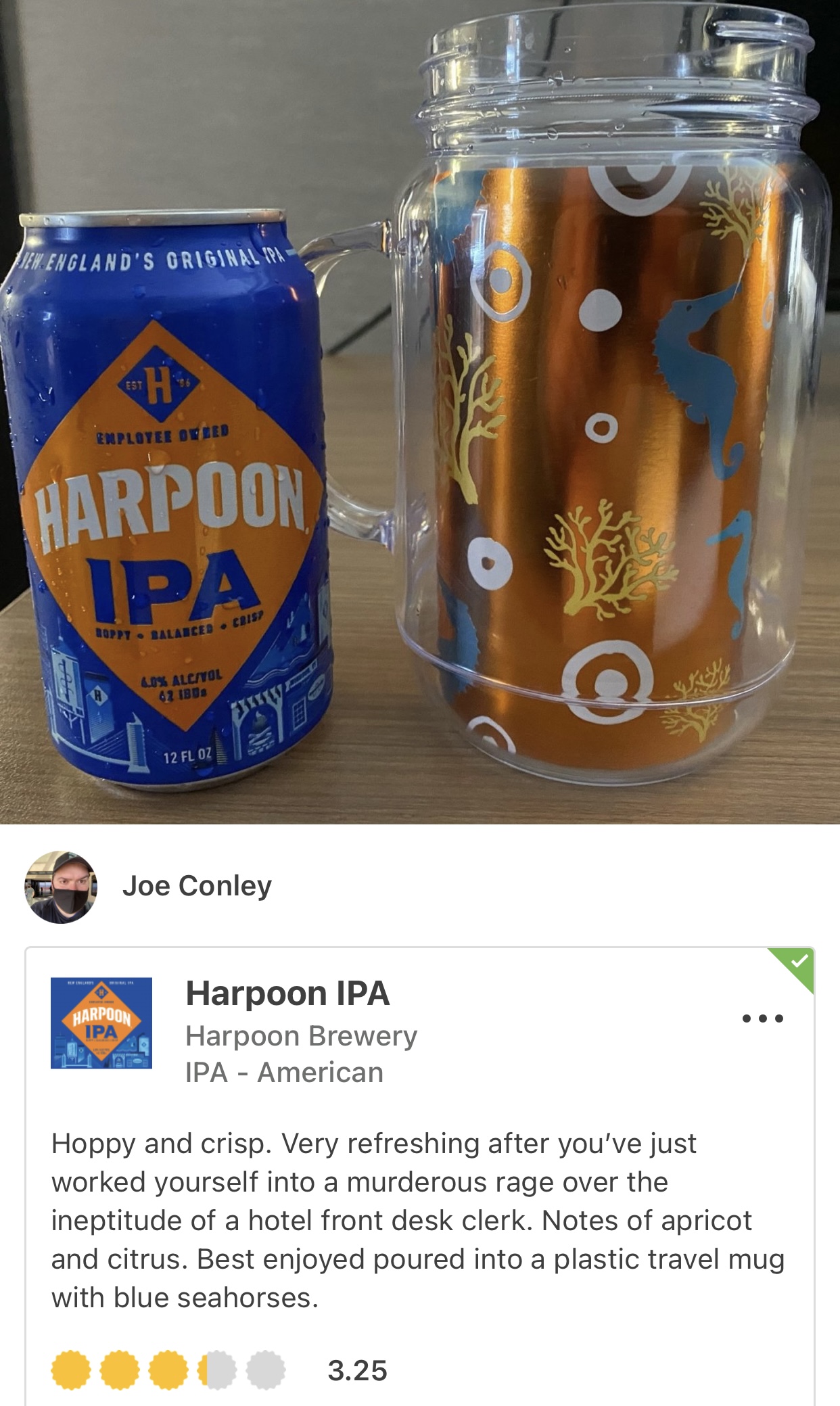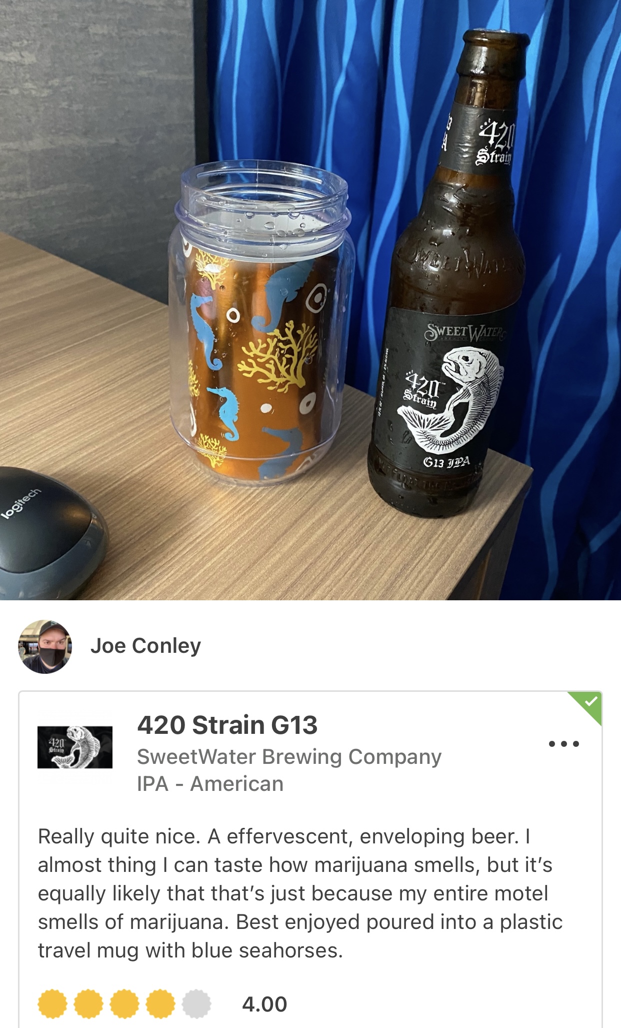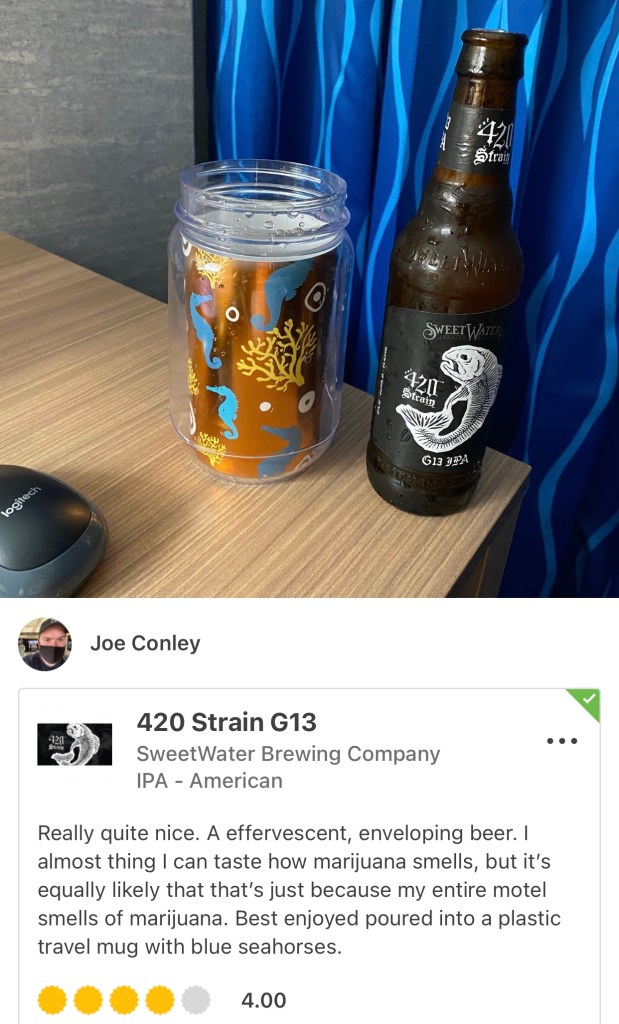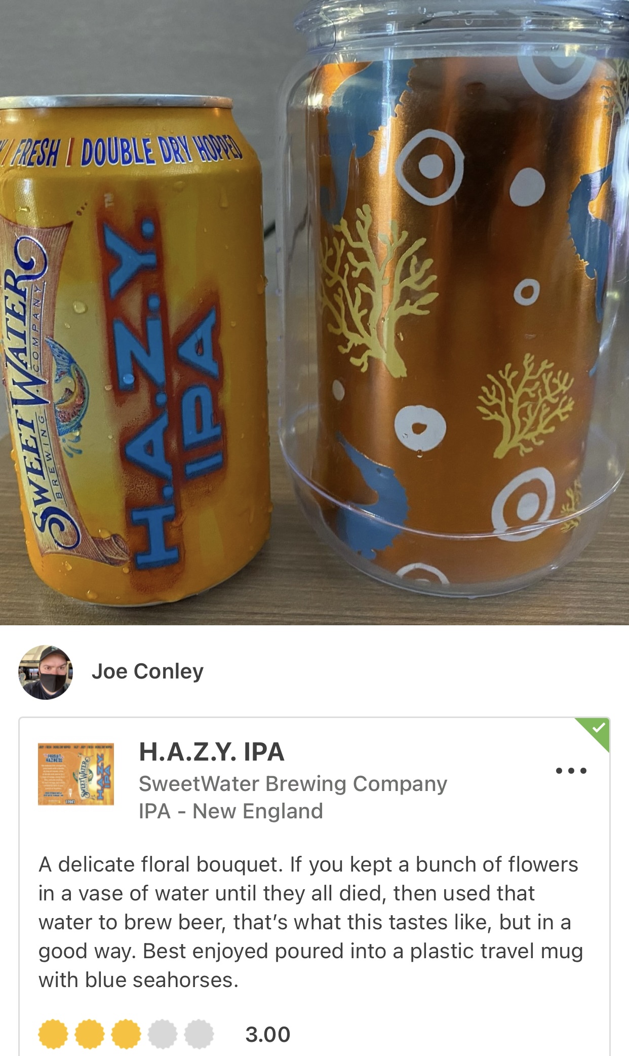 I recalled the other day that I have an app on my phone called Untappd for rating and recommending beers you try, which is a great way to keep track of new beers so you can refer back to them later. It’s been more than a year since I’ve used it, because, you know, pandemic, so I didn’t remember it until now, which is annoying, since there were several California craft beers I tried and I’ve completely forgotten their names.