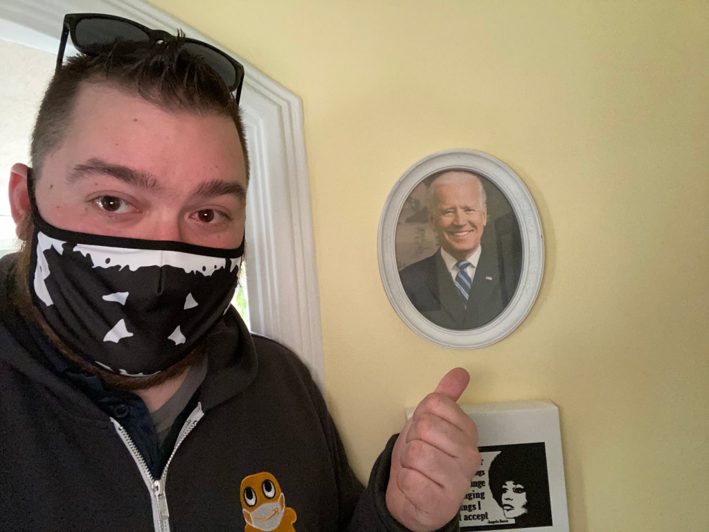 As I write this, I’m sitting in their second dining room which we don’t use for dining. Joe Biden’s comforting smile is at three o’clock. To my right is a shrine, to my left is a Christmas tree and a record player, above the table is an enormous chandelier with Mardi Gras beads, behind me is the yoga studio. Around the corner is the portion of the wall dedicated to cat portraits of Nadine.