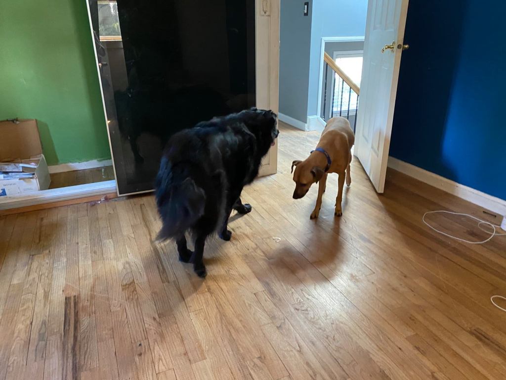 Also, the first day I gave them each a peanut-butter stuffed Kong as a treat and now Kiba keeps carrying his empty Kong up to me and then looking at me all “Fill it up, motherfucker.”