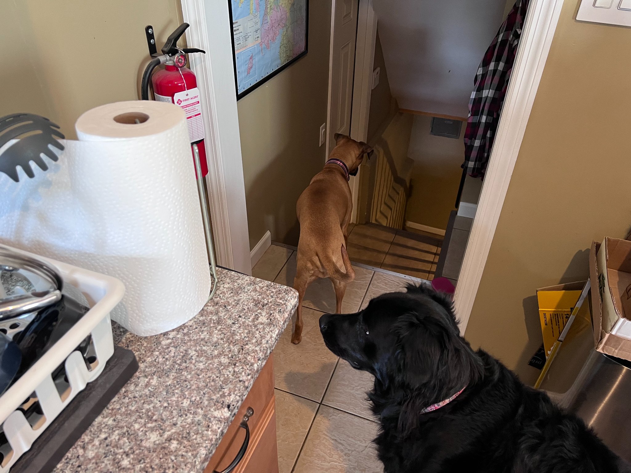 About an hour or so ago I dropped Chance and Meaghan off at the airport and now I’m back here and the mood has shifted. Kiba and Rukia almost immediately sensed that something was off, and spent some time at the top of the stairs looking at the door. They’ve searched the house twice, and have now moved on to “something is deeply wrong”.
