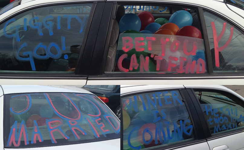 All that proved more or less irrelevant, however, because what I was really waiting for was the opportunity to tag my sister’s car. As this was my first time being involved in a wedding it was also my first opportunity to do terrible things to the couple’s getaway vehicle. When I was reminded of my sacred duty the night before the wedding, I quickly conferred with the best man. I was under the impression that this was the best man’s responsibility to own, but the best man (who, out of respect for his privacy, I will only refer to as “Matthew” had not prepared anything). I immediately undertook a midnight drive to the local Wal-Mart where I tracked down some window markers, a sizable case of balloons, and some raw fish.