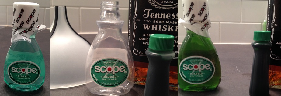 I bought a couple bottles of mouthwash and dumped the contents down the drain. I rinsed them out a few times with hot water, then filled them 9/10s full of Jack Daniels and added a single drop of green food coloring. Put the caps back on, gave the bottle a quick shake, and it’s mouthwash you don’t want to spit out.